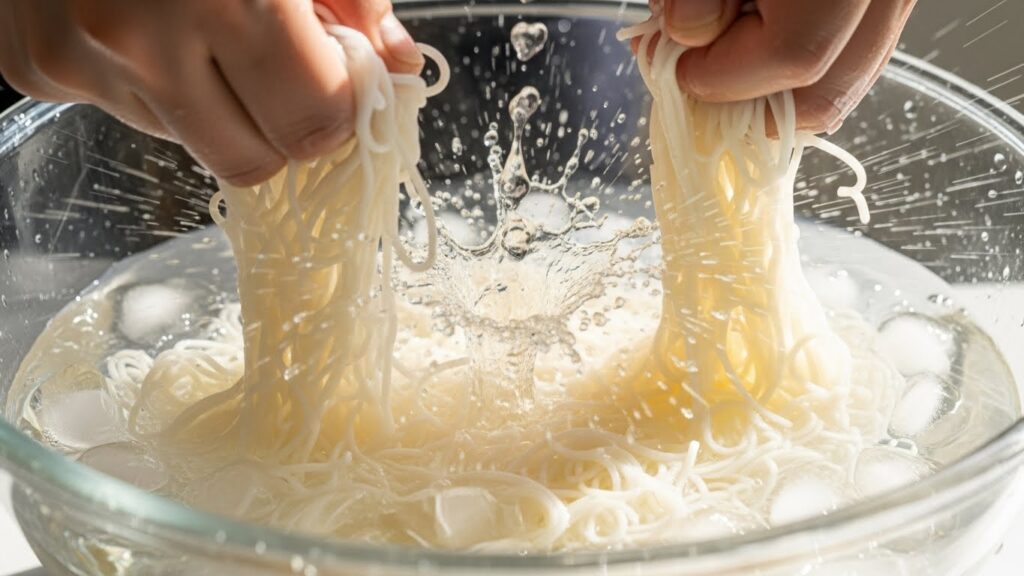대충 헹구지 말고 손으로 비벼가며 씻어야 면발이 코팅된 것처럼 매끄럽고 쫄깃해집니다.