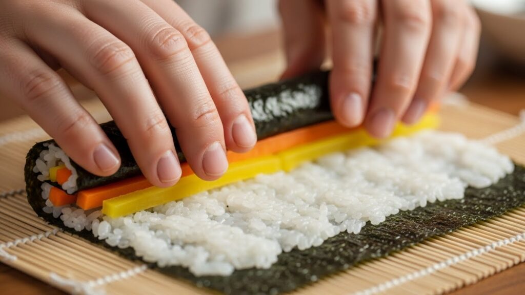 돌돌 말아준 뒤, 김의 끝부분이 바닥으로 가게 놓아주세요.