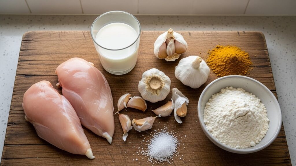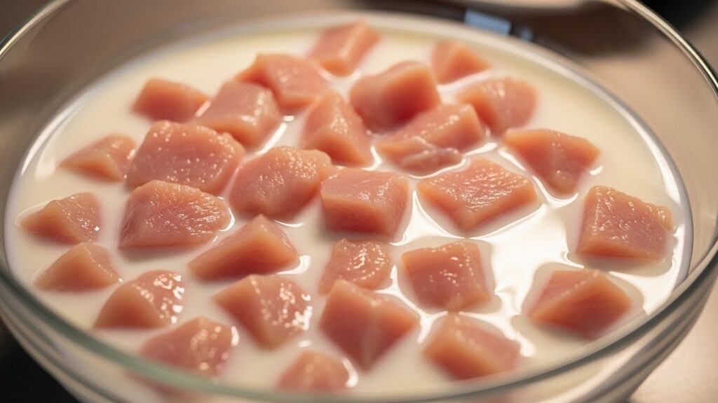 썰어둔 닭가슴살을 볼에 담고 우유를 자작하게 부어주세요. 약 20분간 재워두면 우유의 단백질 분해 효소가 고기를 연하게 만들고, 특유의 비린내를 싹 잡아줍니다. 이 과정은 절대 생략하지 마세요!