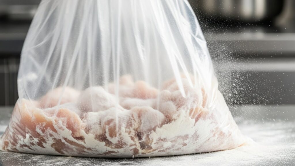 여기에 밑간 한 닭고기를 넣고, 봉지 입구를 잡은 뒤 신나게 흔들어주세요!