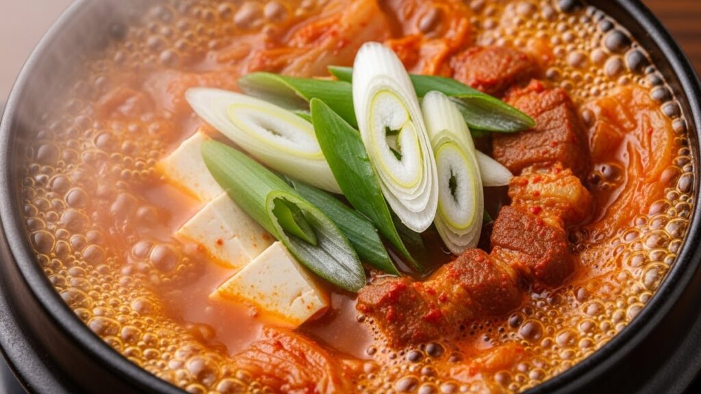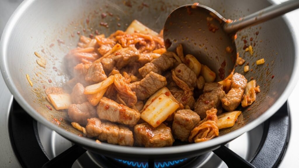 - 물 붓기 전, 고기와 김치를 충분히 볶는 과정이 맛을 결정합니다.