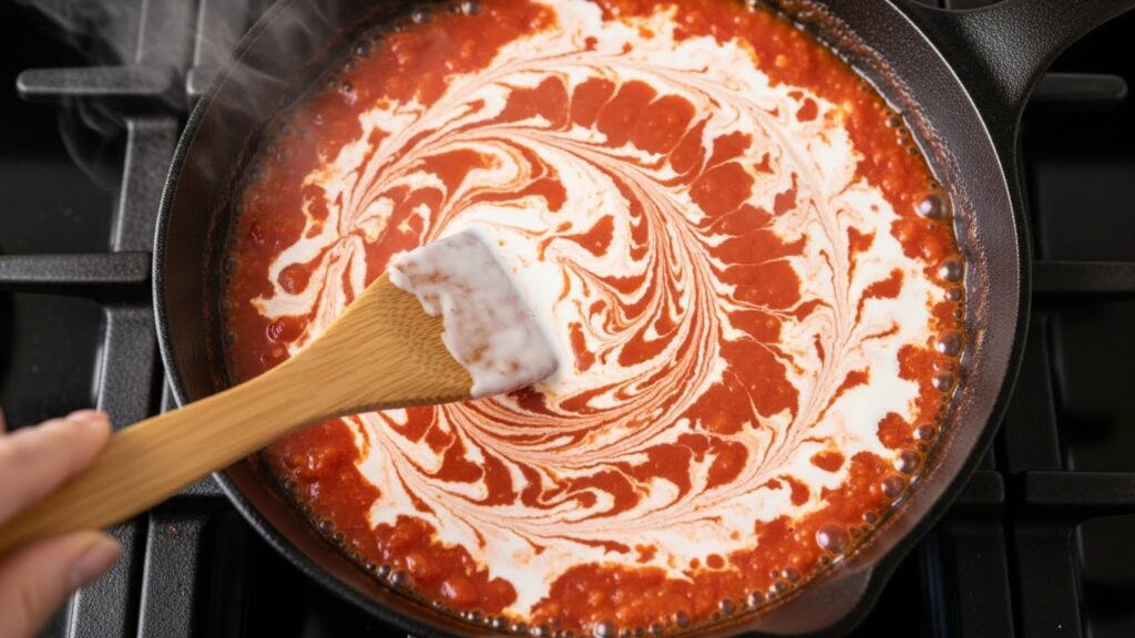 토마토 소스와 생크림을 1:1 비율로 넣고 끓입니다.