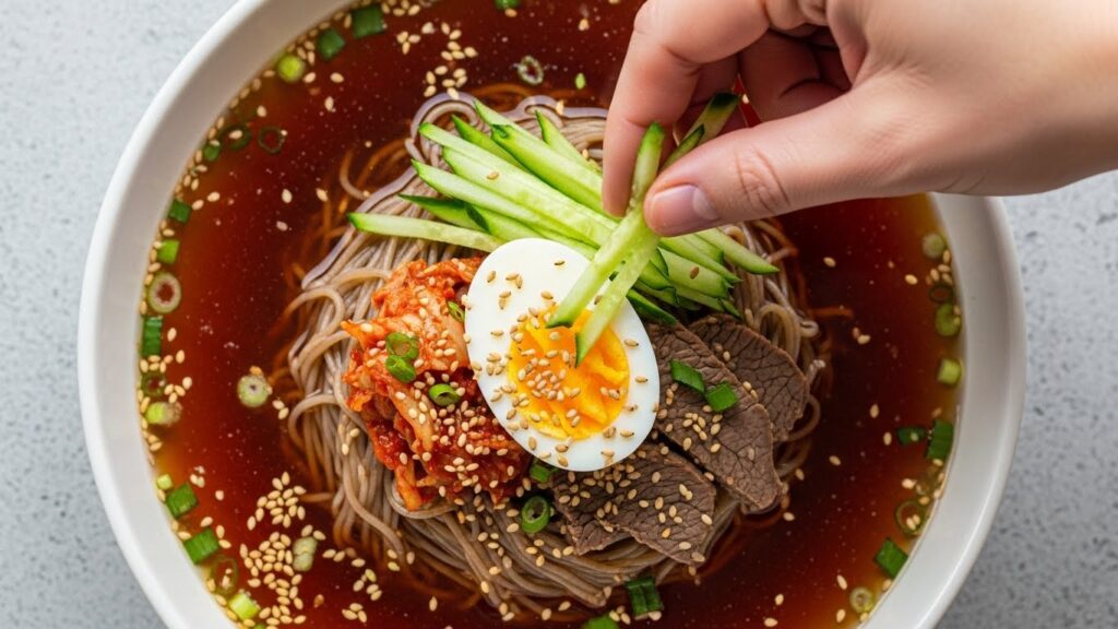 채 썬 오이, 삶은 달걀 반쪽을 올리면