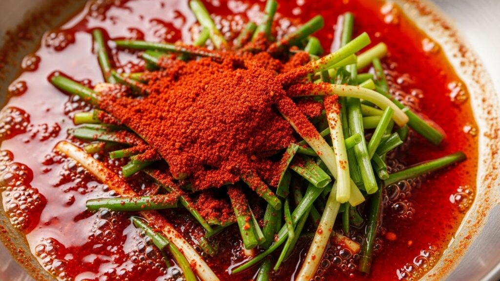 순두부찌개 양념의 핵심은 기름에 파와 고춧가루를 볶아내는 과정에 있습니다.
