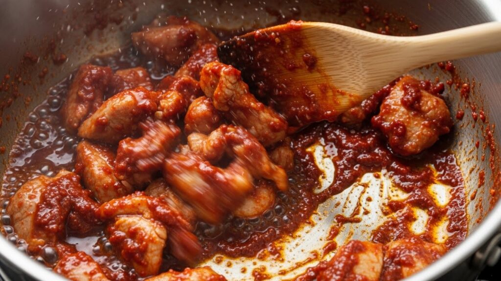 어렵게만 생각했던 고추장찌개, 핵심은 ‘고기와 고추장을 먼저 기름에 볶는 것’이었습니다.