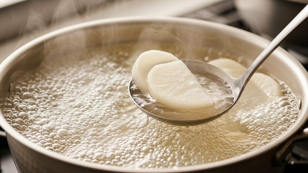 다시마를 건져낸 후, 중불로 줄여서 15분 이상 푹 끓여줍니다. 무가 투명하게 익을 때까지 기다려주세요. 무에서 시원한 맛이 충분히 우러나와야 합니다.