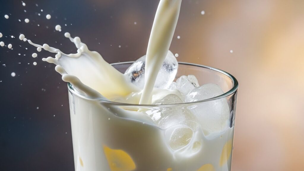 4. 다른 컵에 얼음을 가득 채우고 우유 200ml를 붓습니다.