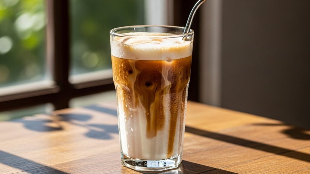 5. 만들어둔 바닐라 커피 원액을 천천히 우유 위에 붓습니다.