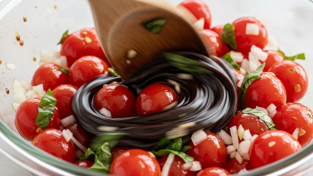너무 세게 섞으면 토마토가 으깨질 수 있으니 아기 다루듯이 조심스럽게 다뤄주세요.