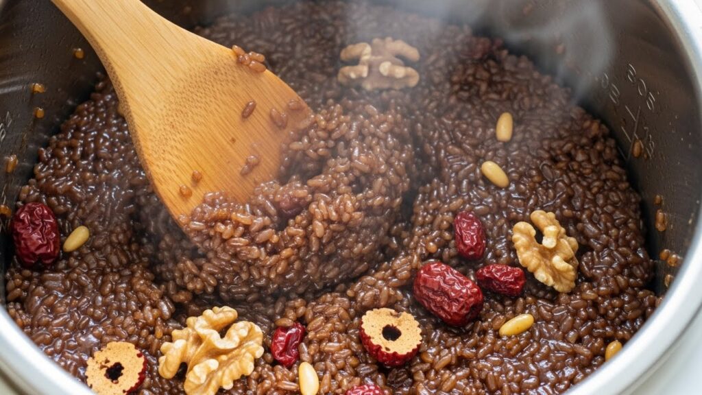 찹쌀을 불리지 않기 때문에 물 양을 일반 밥보다 조금 적게 잡는 것이 핵심입니다.