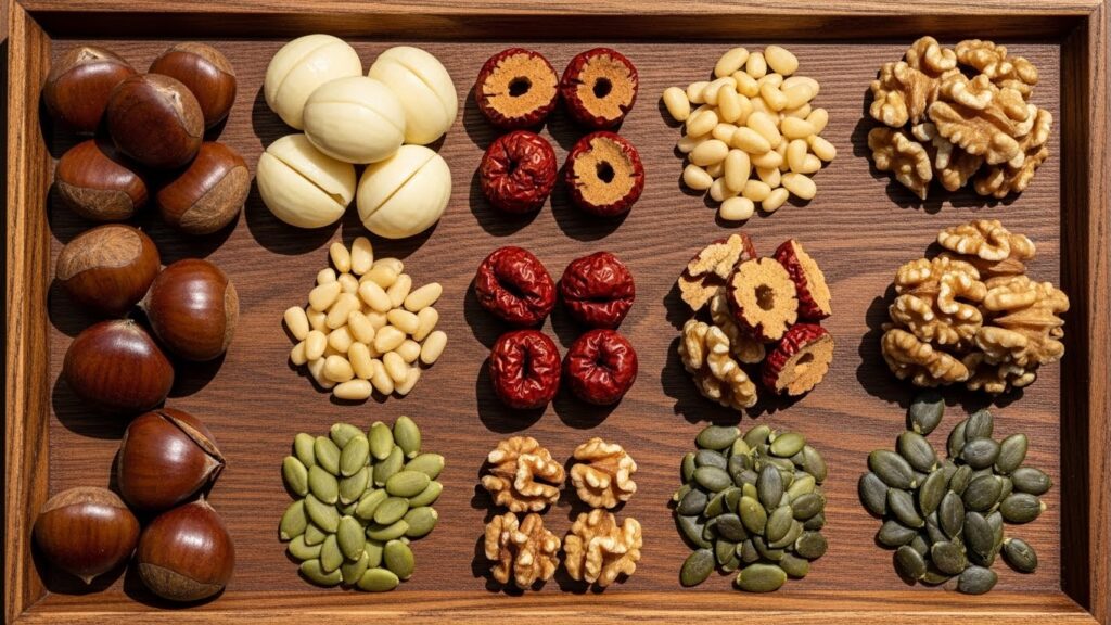 그리고 고명으로는 밤, 대추, 견과류(호두, 잣, 해바라기씨 등)를 취향껏 넉넉히 준비하시면 됩니다.