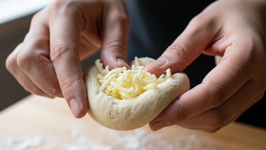 따라서 반죽 두께를 0.5cm 정도로 유지하면서 치즈를 감싸는 것이 가장 이상적입니다.