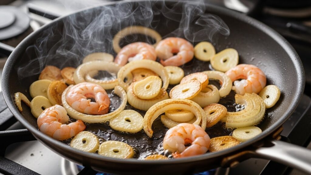 팬에 식용유(또는 버터)를 두르고 다진 마늘과 채 썬 양파를 먼저 볶아주세요.