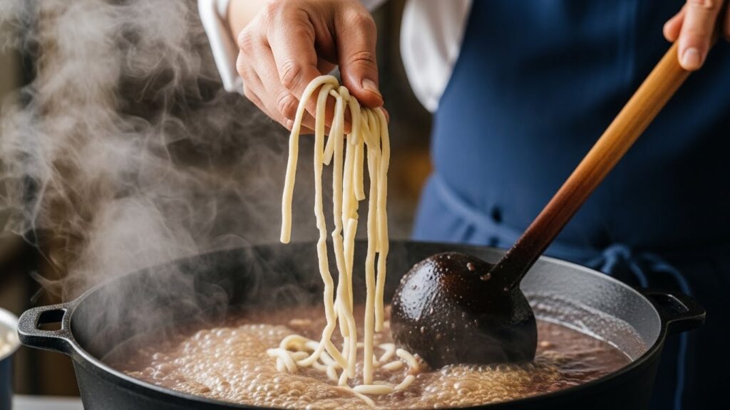 그래서 저는 면을 넣기 직전에 찬물에 가볍게 헹궈 겉면의 전분을 씻어냅니다.
